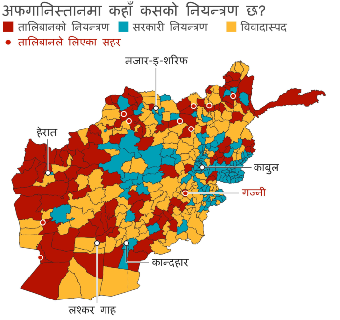 विदेशी सैनिकहरू अफगानिस्तानबाट फर्किन थालेपछि अहिले तालिबान लडाकुहरूले महत्त्वपूर्ण सहर र स्थानहरू आफ्नो नियन्त्रणमा लिन थालेका छन्। विभिन्न स्थानमा सङ्घर्ष जारी छ। अधिकांश नेपालीहरू राजधानी काबुलस्थित कूटनीतिक र सरकारी कार्यालयहरू भएको क्षेत्रमा कार्यरत रहेकाले अहिलेसम्म सुरक्षित रहेको मन्त्रालयले जनाएको छ।