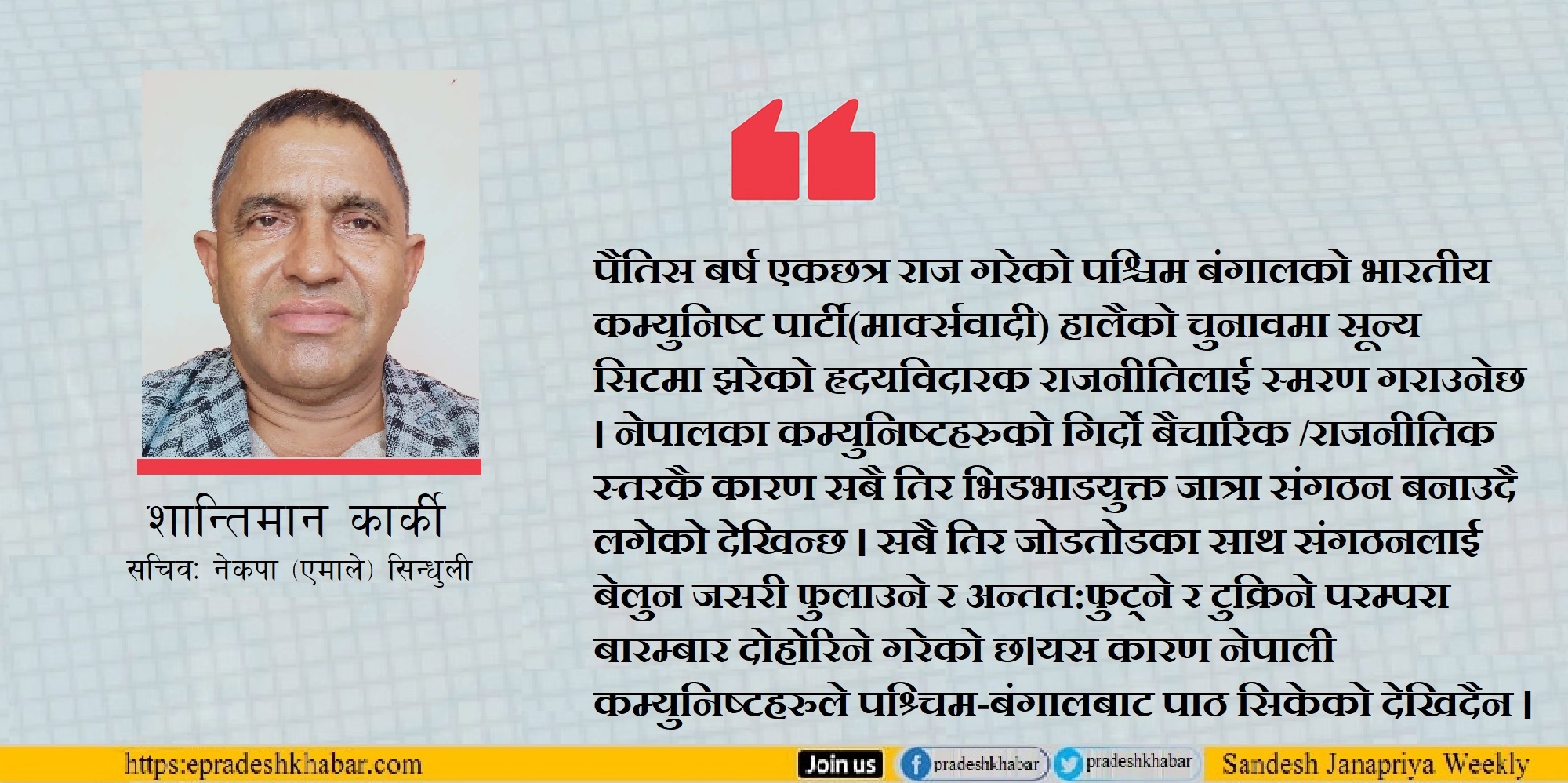 तर एमालेमैं पनि ब्यवहारवादी बन्ने नाममा बिचार र सिद्धान्तलाई फाल्तु कामको संज्ञा दिने कामरेडहरुको कमी देखिदैन । यसले पक्कै पनि पैतिस बर्ष एकछत्र राज गरेको पश्चिम बंगालको भारतीय कम्युनिष्ट पार्टी(मार्क्सवादी) हालैको चुनावमा सून्य सिटमा झरेको हृदयविदारक राजनीतिलाई स्मरण गराउनेछ। नेपालका कम्युनिष्टहरुको गिर्दो बैचारिक /राजनीतिक स्तरकै कारण सबै तिर भिडभाडयुक्त जात्रा संगठन बनाउदै लगेको देखिन्छ।सबै तिर जोडतोडका साथ संगठनलाई बेलुन जसरी फुलाउने र अन्तत:फुट्ने र टुक्रिने परम्परा बारम्बार दोहोरिने गरेको छ । यस कारण नेपाली कम्युनिष्टहरुले पश्र्चिम-बंगालबाट पाठ सिकेको देखिदैन।त्यसै कारणले नै होला गत चुनावमा संसदको दुई तिहाई सिट जित्न सफल ने.क.पा(नेकपा) आफ्नो पाँच बर्षे कार्यकाल पुरा गर्नु त कता हो कता एकपल्ट फुट्दा तिन टुक्रा भएको छ ।सायद जन आधारित योजना बनाएर ठिक ढंगले पार्टीलाई चलाएको भए पार्टी झनझन् एकताबद्ध हुदै जान्थ्यो । यो टुक्रिनु पर्ने अबस्था आउने नै थिएन । पार्टीको केन्द्र देखि स्थानीय तहसम्मको नेतृत्व पंक्ती हेर्दा बिचार र ब्यबहारमा निकै नै जटिल समस्याहरु रहेको आभास हुन्छ । यसलाई आगामी महाधिवेसनले ठोस रुपमा हल गर्नु पर्दछ ।