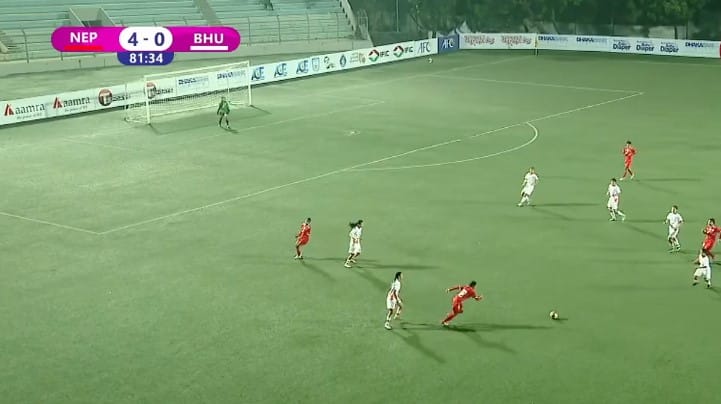 बंगलादेशमा जारी साफ यू-१९ महिला च्याम्पियनसिपअन्तर्गत आफ्नो तेस्रो खेलमा नेपालले भुटानलाई ४-० गोलले हराउँदै तालिकाको शीर्षस्थानमा उक्लिएको छ।