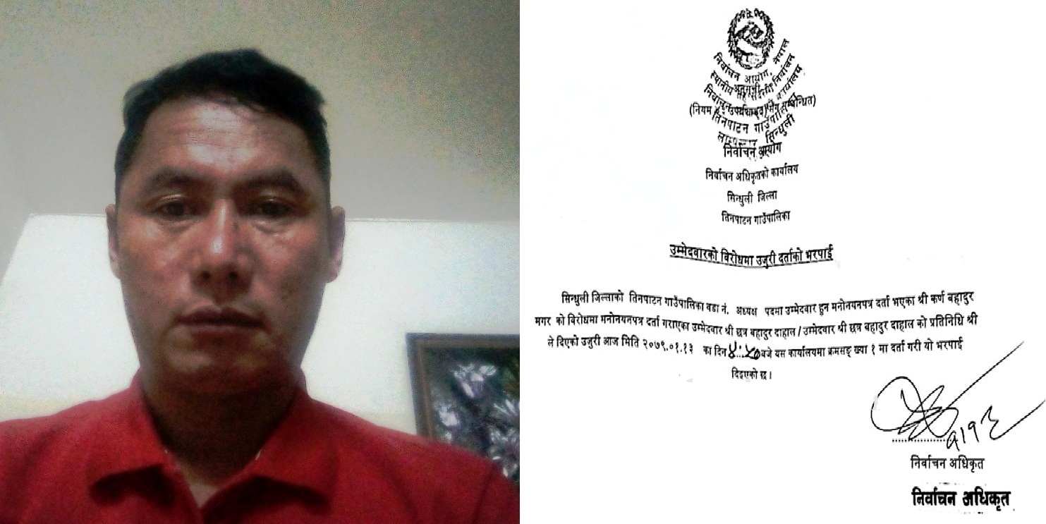 उहाँको उम्मेदवारीको खारेजिको मागगर्दै अध्यक्षका प्रत्यासि छत्रबहादुर दाहालले निर्वाचन अधिकृतको कार्यालयमा उजुरी दर्ता गराउनु भएको थियो ।
