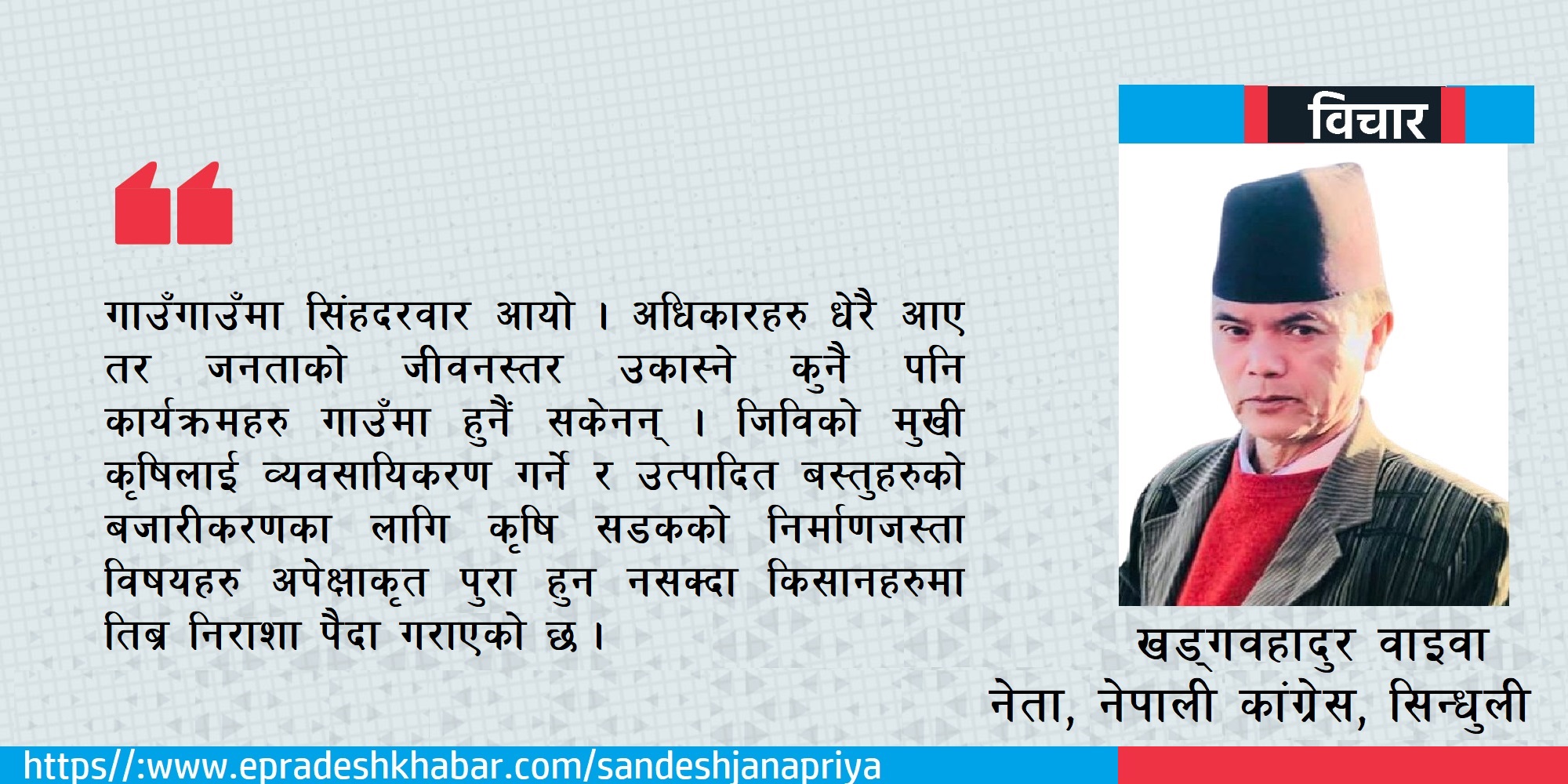 राजनीति भनेको समाजसेवा हो । नेपाली कांग्रेस र विपिले देख्नुभएको आदर्श पनि यहीनैं हो । तर अहिले राजनीतिलाई पेशा व्यवसाय बनाउनेहरुको जमात बढिरहेको छ । विपी र गिरिजावावुले देखाएको आदर्श हराउँदैछ । हाम्रो गाउँ टोलमा भौतिक पुर्वाधाहरु सडक, मोटरबाटो, खानेपानी, बिजुली, स्वास्थ्य, शिक्षा, कृषि–पसुपन्छी पालनको बिकास र दुग्ध विकासलगायत ठाउँअनुसारका फलफुल तरकारिको उत्पादनलाई बढाउनुका साथै कृषि उद्यमसिलता बिकास गरि जिबिकोपार्जनका कार्यक्रमहरु अगाडि बढ्नै सकेनन् ।