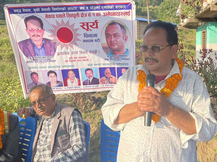जिनाखु, सिन्धुली/नेकपा (एमाले) सिन्धुली क्षेत्र नंम्बर १ का प्रतिनिधि सभा सदस्य पदका उम्मेदवार प्रदीप कटुवालले यस क्षेत्रको विकास गर्नु मेरो कर्तव्य भएको बताउनु भएको छ ।