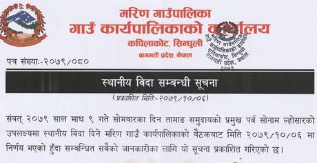‘संवत् २०७९ साल माघ ९ गते सोमबारका दिन तामाङ समुदायको प्रमुख पर्व सोनाम ल्होसारको उपलक्ष्यमा स्थानीय बिदा दिने मरिण गाउँ कार्यपालिकाको बैठकबाट मिति २०७९/१०/०६ मा निर्णय भएको हुँदा सम्बन्धित सबैको जानकारीका लागि यो सूचना प्रकाशित गरिएको छ,’ सूचनामा भनिएको छ ।