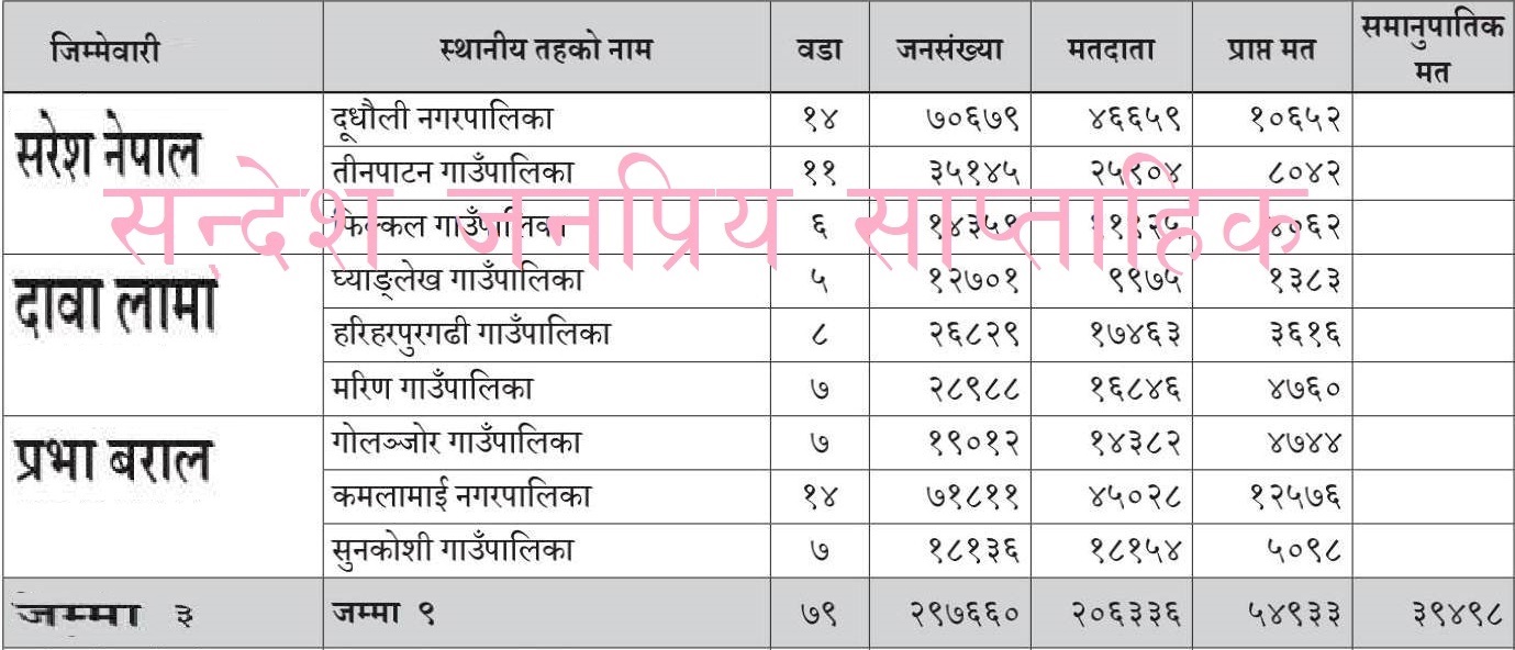 पार्टी केन्द्रले सिन्धुली जिल्लाको नौं स्थानीय तहका लागि भन्दै अन्य जिल्लाका केन्द्रीय सदस्यहरुलाई सिन्धुली जिल्लामा कार्यक्षेत्र बनाएर खटाएको छ । जस अनुसार दुधौली नगरपालिका, फिक्कल गाउँपालिका र तीनपाटन गाउँपालिकामा सरेश नेपाल, ध्याङलेख, हरिहरपुरगढी र मरिण गाउँपालिकामा दाबा लामा, कमलामाई नगरपालिका, गोलन्जोर र सुनकोशी गाउँपालिकामा प्रभा बराललाई जिम्मेवारी तोकेको छ । एक जिल्लाको नेतालाई अर्को जिल्लामा पठाएको संगठनको वास्तविक अबस्था र जिल्ला नेताहरुको स्थानीय नेता कार्यकर्ताहरुमा प्रभाव पनि थाहा लाग्ने एमालेको बुझाई रहेको छ ।