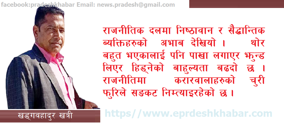 आफ्नालाई होइन, राम्रा बिचार बोकेका कार्यकर्ता लाई अगाडि बढाऔं । देशलाई समृद्धको दिशामा अघि बढाऔं र जनता लाई निराशाबादी होइन आशाबादी बनाऔं । तबमात्र लोकतन्त्र बलियो हुनेछ । लोकतन्त्रमा जनताले बिकाश र न्यायको अनुभूती गर्न पाउनु पर्छ । नेताले कृति राख्ने काम गर्नु प¥यो । करारवाला पद लाई सहि रुपमा प्रयोग गर्नु अति उत्तम देखिन्छ । अन्यथा जनताले न्यायको अनुभूती गर्न पाउने छैनन् । यसले मौजुदा ब्यबस्था कमजोर बनाउने निश्चित छ । (लेखक खत्री कमलामाई नगरपालिका सिन्धुलीका पूर्व मेयर हुन्)