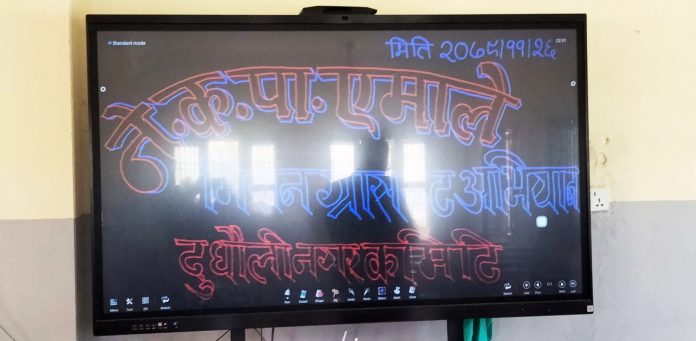 नेपाल कम्युनिष्ट पार्टी (एमाले) दुधौली नगरकमिटीद्धारा अयोजित मिसन ग्रासरुट अभियानमा अनौठो दृश्य देखियो । कार्यक्रममा प्रमुख अतिथिका रुपमा उपस्थित हुनुभएका एमाले बाग्मी प्रदेश कमिटी सदस्य खड्गवहादुर खत्रीलाई नेता कार्यकर्ताहरुले माला र खादा पनि लगाएनन् अनि मञ्चमा पनि राखेनन् ।