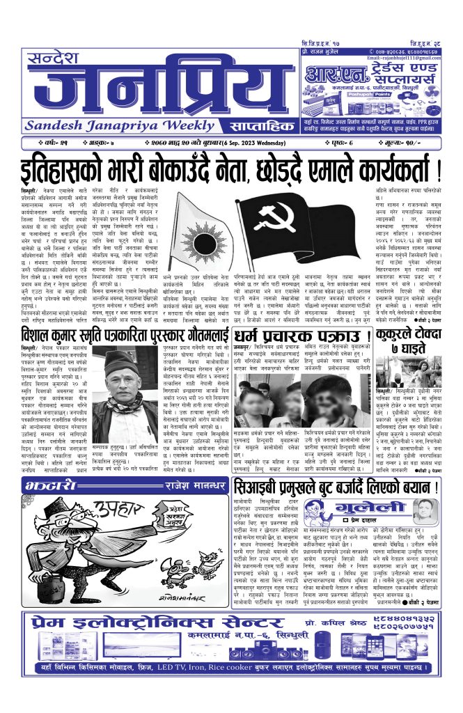 सन्देश जनप्रिय साप्ताहिक मिति २०८० भाद्र २० गते बुधवार प्रदेशखबर संवाददाता - २० भाद्र २०८०, बुधबार १६:५२ janapriya saptahik anka 7- 2080 Bhadra 20 epaperDownload