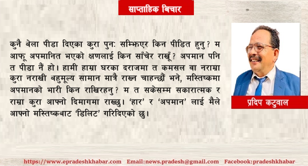 यहाँसम्म आउँदा मैंले जीवनमा अनेक पटक अपमान भोगेको छु । तर म तिनलाई मेरो मस्तिष्कमा भेला पारेर कहिल्यै राख्दिनँ । तिनलाई बिर्सिदिन्छु । कुनै बेला पीडा दिएका कुरा पुनः सम्झिएर किन पीडित हुनु ? म आफू अपमानित भएको क्षणलाई किन साँचेर राखूँ ? अपमान पनि त पीडा नैं हो । हामी हाम्रा घरका दराजमा त कमसल वा नराम्रा कुरा नराखी बहुमूल्य सामान मात्रै राख्न चाहन्छौं भने, मस्तिष्कमा अपमानको भारी किन राखिरहनु ? म त सकेसम्म सकारात्मक र राम्रा कुरा आफ्नो दिमागमा राख्छु । ‘हार’ र ‘अपमान’ लाई मैले आफ्नो मस्तिष्कबाट ‘डिलिट’ गरिदिएको छु ।