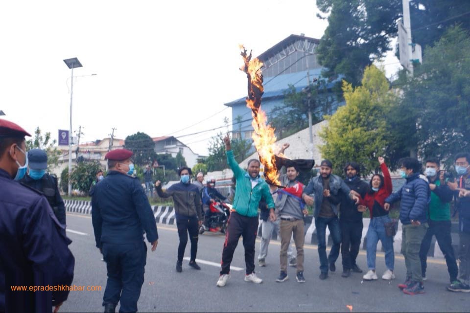सोही क्रममा सोमबार मध्यान्न उनीहरुले मोदी र ओलीको पुत्ला जलाएका हुन् । आइतबार संसद भवन अगाडि प्रदर्शन गरेका उनीहरुले शनिबार माइतीघरमा जुलुश निकालेका थिए ।