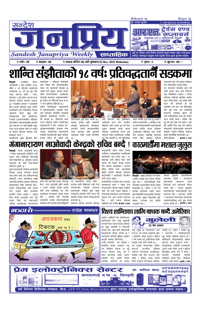 सन्देश जनप्रिय साप्ताहिक अंक १५ मिति २०८० मंसिर ०६ गते बुधवार प्रदेशखबर संवाददाता - ६ मंसिर २०८०, बुधबार १४:०५ janapriya saptahik anka 15 – 2080 Mangsir 15 epaper pageDownload