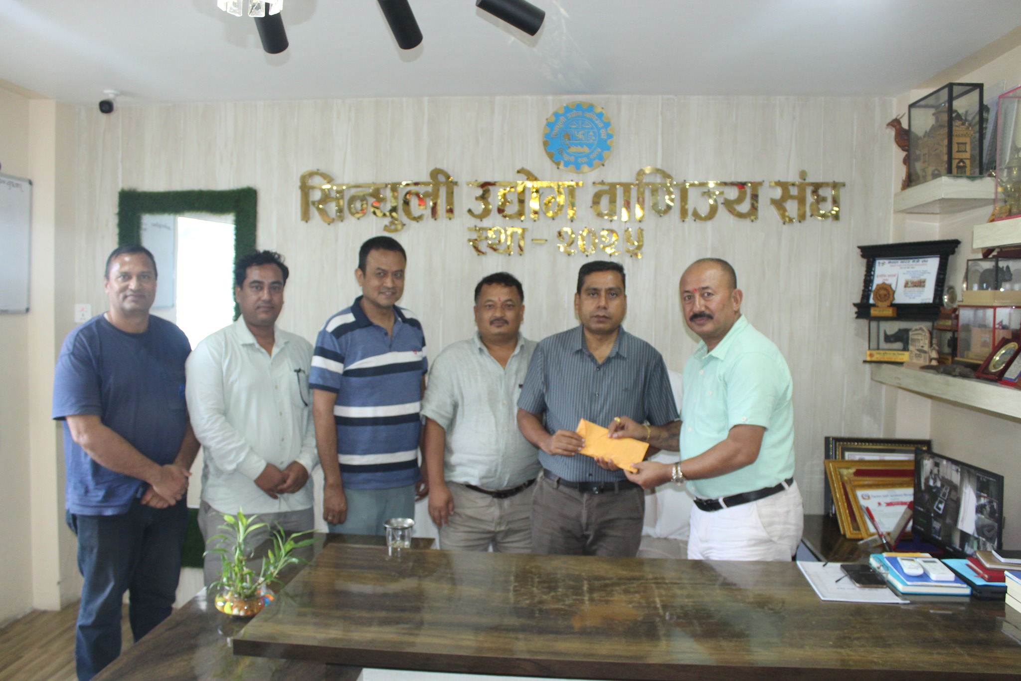 सो रकम आज सिन्धुली स्थित संघको कार्यालयमा अध्यक्ष श्रेष्ठले उद्योग बाणिंज्य संघ बर्दिवासका अध्यक्ष विष्णु बहादुर खड्कालाई हस्तान्तरण गर्नु भएको छ ।
