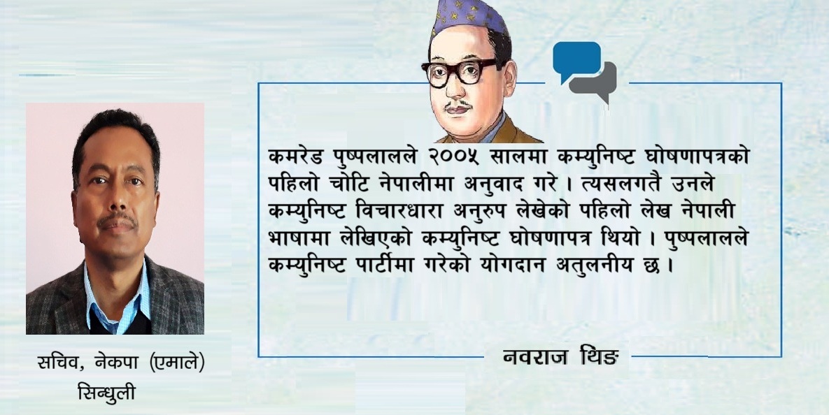 पुष्पलालको शक्तिनैं विचार हो । उनकै विचारका कारणले कम्युनिष्ट पार्टी अहिलेसम्म जीवित छ । सामान्य नेता आन्दोलनले जन्माउँछ । त्यसले आन्दोलन र विद्रोह पनि जन्माउँछ भन्ने प्रमाण पुष्पलाल हुन् । यो सबै नेपाल कम्युनिष्ट पार्टीको नाम र योगदान विना सम्भव थिएन । नेपालमा नेकपा र कम्युनिष्ट आन्दोलनका प्रणेता एवम् इतिहास पुरुष पुष्पलाल हुन् । उनलाई नसम्झी कम्युनिष्ट पार्टी सम्झनु अपुरो र साँघुरो रहनेछ ।