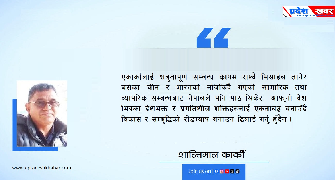 नेपाली जनताको विश्वास र भरोषा हाम्रो लागि सबैभन्दा निर्णायक शक्ति हो । त्यो भरोसा र विश्वासको लागि आवस्यक आन्तरिक समस्याहरुको उचित सम्बोधन र कार्यान्वयन तर्फ पनि सरकारले ध्यानाकर्षण हुनुपर्दछ । एकार्कालाई शत्रुतापूर्ण सम्बन्ध कायम राख्दै मिसाईल तानेर बसेका चीन र भारतको नजिकिंदै गएको सामारिक तथा व्यापरिक सम्बन्धबाट नेपालले पनि पाठ सिकेर आफ्नो देश भित्रका देशभक्त र प्रगतिशील शक्तिहरुलाई एकताबद्ध बनाउँदै विकास र सम्बृद्धिको रोडम्याप बनाउन ढिलाई गर्नु हुँदैन । (लेखक नेकपा एमाले बागमती प्रदेश कमिटीका सचिवालय सदस्य हुन् ।)