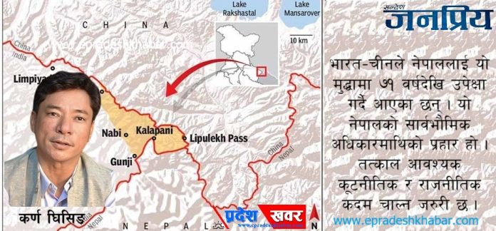 ‘नेपालको संविधानमा देशको आधिकारिक नक्सा समावेश भइसकेको र उक्त नक्सामा महाकाली नदीपूर्वका लिम्पियाधुरा, लिपुलेक र कालापानी नेपालको अभिन्न भूभाग रहेको तथ्यमा नेपाल सरकार स्पष्ट छ । भारत–चीनले नेपाललाई यो मुद्धामा ७१ वर्षदेखि उपेक्षा गर्दै आएका छन् । यो नेपालको सार्वभौमिक अधिकारमाथिको प्रहार हो । नेपाल सरकार र नेपाली जनता भनिरहेका छन्ः दुबैले राष्ट्रिय हितको पक्षमा तत्काल आवश्यक कूटनीतिक र राजनीतिक कदम चाल्न जरुरी छ ।