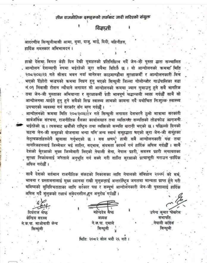 आज बिहान सिन्धुली सदरमुकाममा भएको संयुक्त बैठकले उक्त निर्णय गरेको एमाले उपाध्यक्ष एवम् प्रचार विभाग प्रमुख कर्ण घिसिङले प्रदेशखबरलाई जानकारी दिए । बैठकमा सहभागी नेता घिसिङका अनुसार जेनजी आन्दोलनका क्रममा भएका आगजनी लुटपाटका घटना अराजक समूहले गराएको निश्कर्ष निकाल्दै लोकतान्त्रिक मूल्य मान्यताका आधारभूत स्तम्भहरु माथि षडयन्त्र नगर्न माग गरेको छ । बैठकपछि जारी गरिएको संयुक्त विज्ञप्तीमा नेपाली कांग्रेस सिन्धुलीका सभापति उपेन्द्रकुमार पोखरेल, एमाले अध्यक्ष महेन्द्र देव श्रेष्ठ र माओवादी केन्द्रका केन्द्रीय सदस्य दिर्घराज श्रेष्ठले हस्ताक्षर गरेका छन् ।