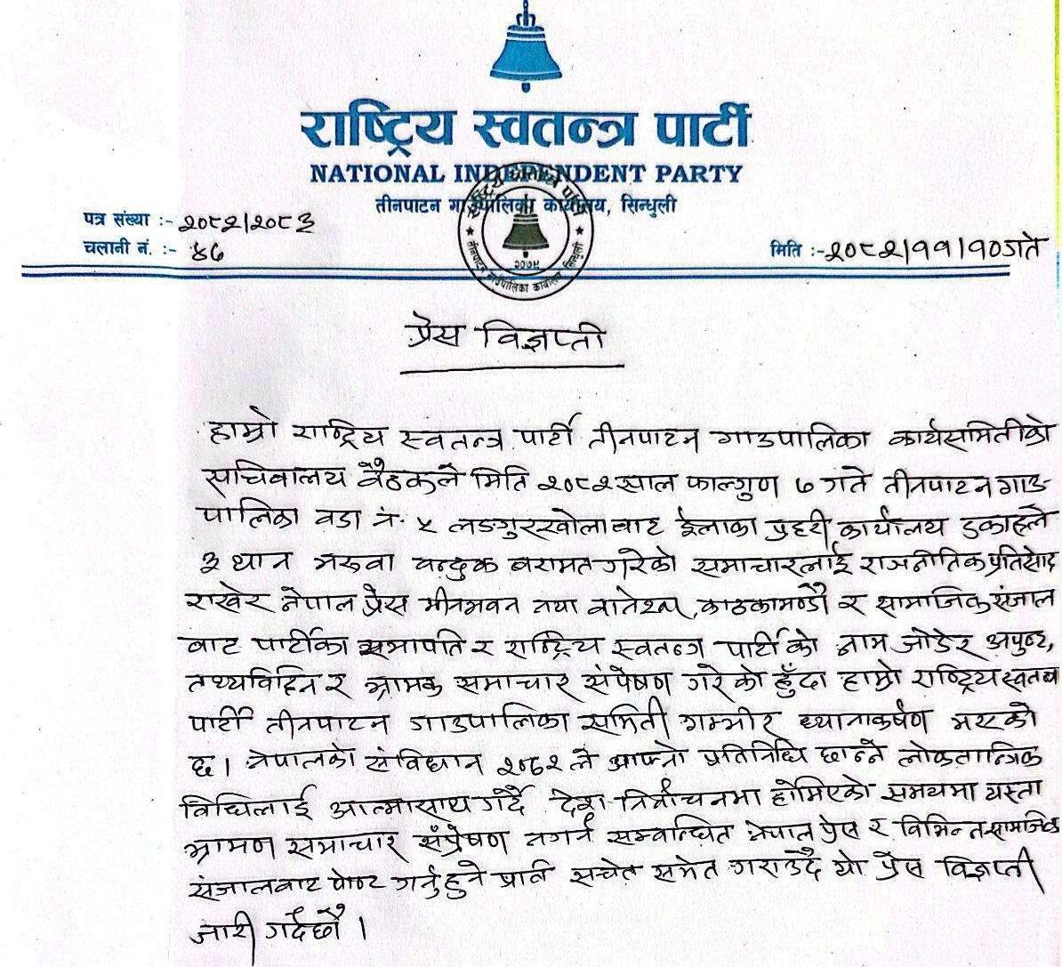 सिन्धुली: राष्ट्रिय स्वतन्त्र पार्टी तीनपाटनले आज एक प्रेस बिज्ञप्ती जारीगर्दै हतियार बरामद प्रकरणमा पार्टी अध्यक्ष र पार्टीको नाम जोडिएकोमा दुःख व्यक्त गरेको छ ।