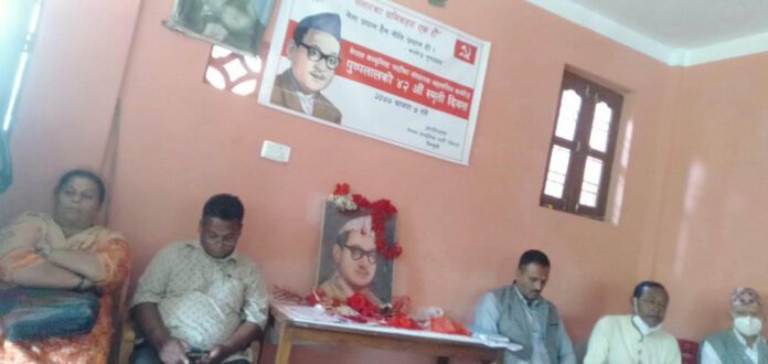 नेपाल कम्युनिष्ट पार्टी सिन्धुलीले एक कार्यक्रमका बीच कम्युनिष्ट पार्टीका संस्थापक महासचिव पुष्पलालको ४२ औं स्मृति दिवश मनाएको छ । पार्टीभित्र गुटबन्दी हाबी भएका बेला जिल्ला पार्टी कार्यालयमा भएको कार्यक्रममा भने सबै नेताले पुष्पलालले देखाएको बाटोबाट अगाडि बढ्ने प्रण गरेका छन् ।