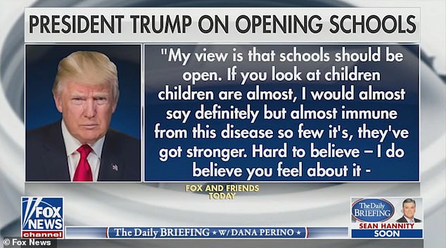 फक्स एन्ड फ्रेन्डस शोमा ट्रम्पले सबै स्कूल फेरि खोल्नुपर्ने बेला आएको बताए । उनले भने “ तपाईले बालबालिकालाई हेर्नु भयो भने बालबालिकाहरू लगभग यो रोगबाट बालबालिकाहरू सुरक्षित रहेका छन् ।”