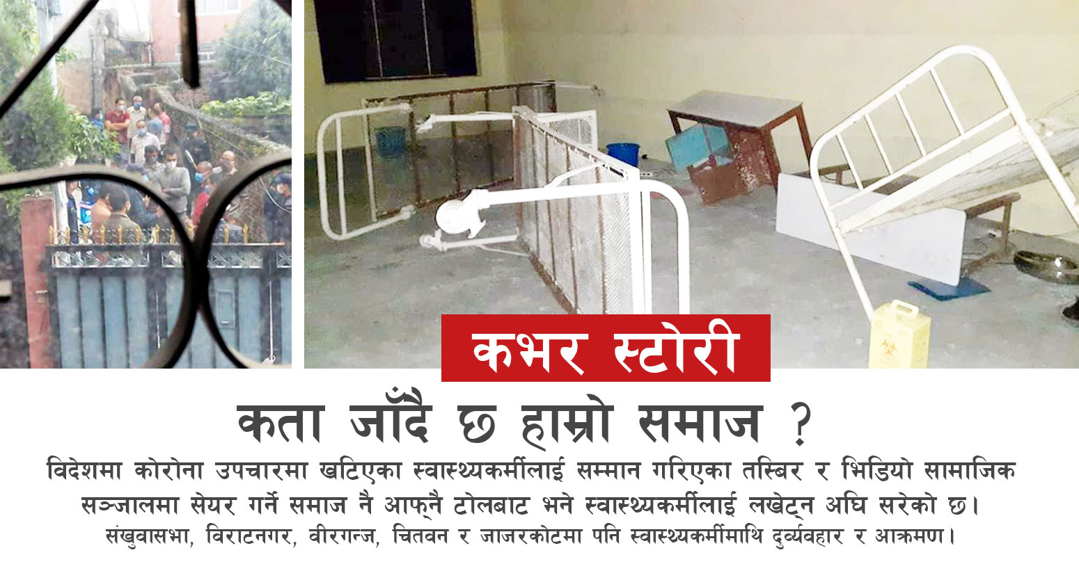 कोभिड महामारीसँग दुनियाँ भिडिरहेको वेला नेपाली समाज भने स्वास्थ्यकर्मीसँग भिड्न थालेको छ । विदेशमा कोरोना उपचारमा खटिएका स्वास्थ्यकर्मीलाई सम्मान गरिएका तस्बिर र भिडियो सामाजिक सञ्जालमा सेयर गर्ने समाज नै आफ्नै टोलबाट भने स्वास्थ्यकर्मीलाई लखेट्न अघि सरेको छ ।