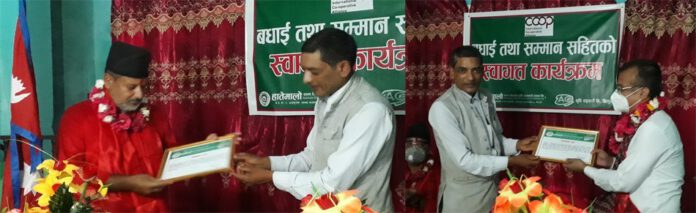 हातेमालोका अध्यक्ष रामबहादुर विश्वकर्माले भुमी सम्बन्धि समस्या समाधान आयोगका केन्द्रिय सदस्यमा देवकोटा चयन हुनु भएकोमा सफल कार्यकालको शुभकामना दिदै सम्मान पत्रले सम्मान गर्नु भएको हो ।