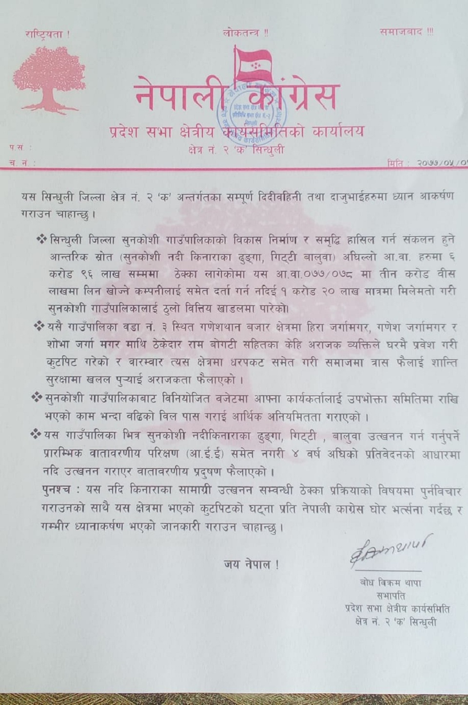 नेपाली काँग्रेस प्रदेश सभा क्षेत्रिय कार्य समिति क्षेत्र नं. २ ‘क’ सिन्धुलीले मंगलबार सुनकोसी गाँउपालिकामा व्यथिती बढ्दै गएको भन्दै चार बुँदे ध्या नाकर्षण पत्र जारी गर्दै आ पत्ति जनाएको छ ।