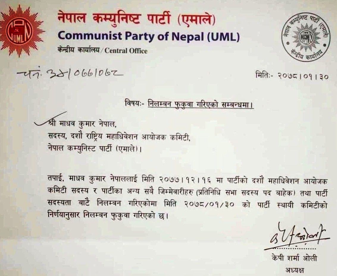 नेकपा (एमाले) अध्यक्ष केपी शर्मा ओलीले वरिष्ठ नेता माधवकुमार नेपालसहित चार नेतामाथिको कारवाही फुकुवा भएको पत्र पठाएका छन्।