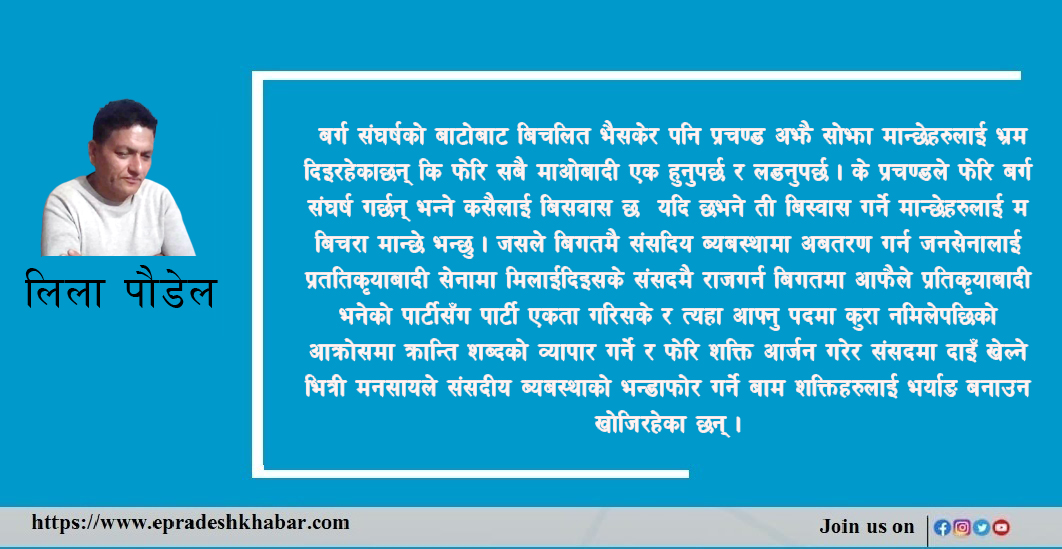 बर्ग सङ्घर्षको बाटोबाट बिचलित भैसकेर पनि प्रचण्ड अझै सोझा मान्छेहरुलाई भ्रम दिइरहेकाछन् कि फेरि सबै माओबादी एक हुनुपर्छ र लडनुपर्छ । के प्रचण्डले फेरि बर्ग सङ्घर्ष गर्छन् भन्ने कसैलाई बिसवास छ ?यदि छभने ती बिस्वास गर्ने मान्छेहरुलाई म बिचरा मान्छे भन्छु । जसले बिगतमै संसदिय ब्यबस्थामा अबतरण गर्न जनसेनालाई प्रततिकृयाबादी सेनामा मिलाईदिइसके संसदमै राजगर्न बिगतमा आफैले प्रतिकृयाबादी भनेको पार्टीसँग पार्टी एकता गरिसके र त्यहा आफ्नु पदमा कुरा नमिलेपछिको आक्रोसमा क्रान्ति शब्दको व्यापार गर्ने र फेरि शक्ति आर्जन गरेर संसदमा दाइँ खेल्ने भित्री मनसायले संसदीय ब्यबस्थाको भन्डाफोर गर्ने बाम शक्तिहरुलाई भर्याङ बनाउन खोजिरहेकाछन् । त्यसकारण नबउदारबाद बहुलबादमा डुबुल्की मारिसकेका र नब उदारबासँग समझौता गरिसकेकाहरुबाट बाम शक्ति बेलैमा सचेत रहन आबश्यक छ ।