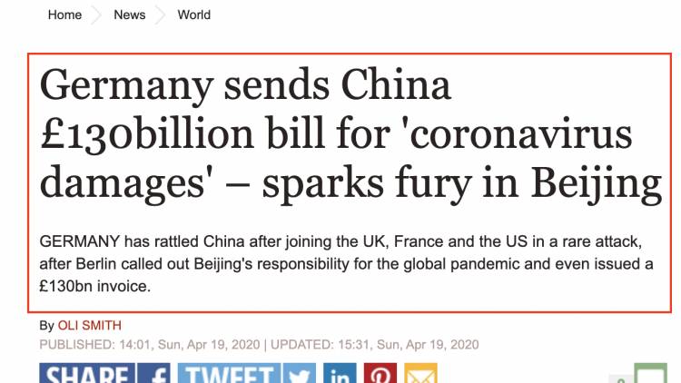 जर्मनीको सबैभन्दा ठूलो ट्याबलोइड अखबार बिल्डमा १ खर्ब ३० अर्ब पाउन्डस्टर्लिङ बराबरको बिलय चीनलाई पठाएको समाचार छापेको हो बिलमा पर्यटन घाटा नोक्सानी २७ अर्ब युरो, फिल्म उद्योग नोक्सानी ७।२ अर्ब युरो , जर्मनी विमान कम्पनी लुफ्थसानाको प्रतिघन्टा खर्च १० लाख युरो र जर्मनीको साना व्यवसायको नोक्सान ५० अर्ब युरो रहेको छ ।
